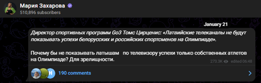 Latvijas pozīcija saistībā ar agresorvalstu sportistiem olimpiskajās spēlēs satracināja arī prokrievisko Telegram kontu darboņus. Piemēram, “Шпроты в изгнании” Latvijas uzvedību dēvēja par “bērnudārzu”.