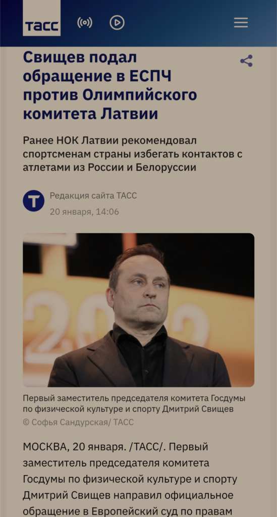 Latvijas Olimpiskās komitejas ieteikumu Latvijas sportistiem distancēties no Krievijas un Baltkrievijas olimpiešiem Kremlis pamanīja un janvāra vidū pat sūdzējās Eiropas Cilvēktiesību tiesā. Nu pienākušas ziņas, ka sūdzība pret Latvijas Olimpiskās komitejas prezidentu Raimondu Lazdiņu ir noraidīta. Maskava gan šādu lēmumu jau esot gaidījusi.