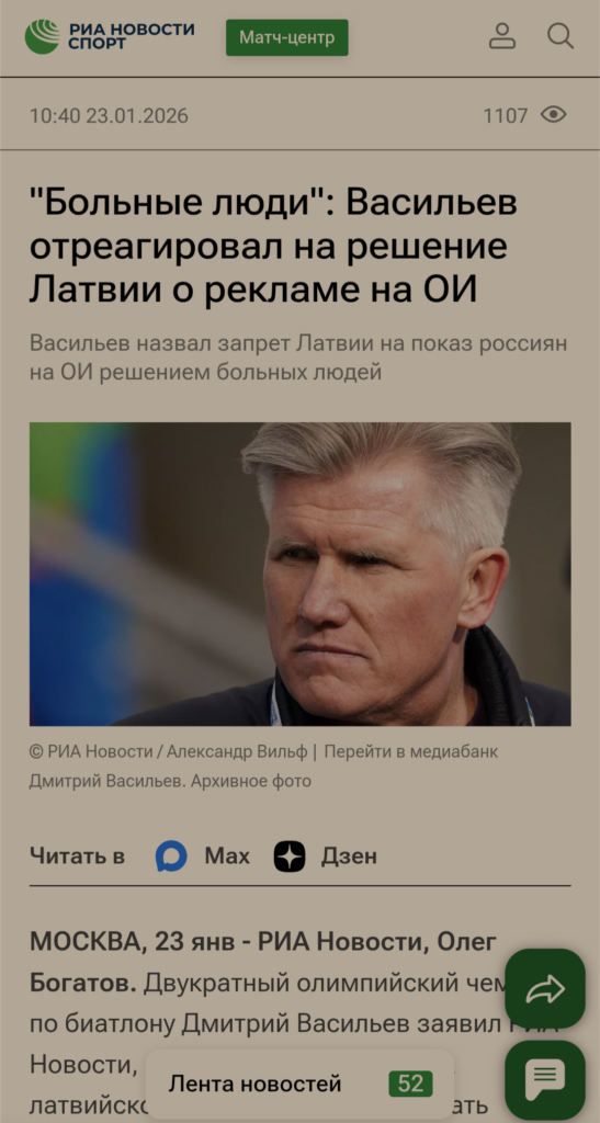 Arī Latvijas Sabiedriskais medijs (LSM) pavēstījis, ka neatspoguļos agresorvalstu sportistu dalību Milānas–Kortīnas Ziemas olimpiskajās spēlēs – saturā neiekļaus informāciju par viņu sasniegumiem un rezultātiem, kā arī nerādīs viņu individuālos startus.